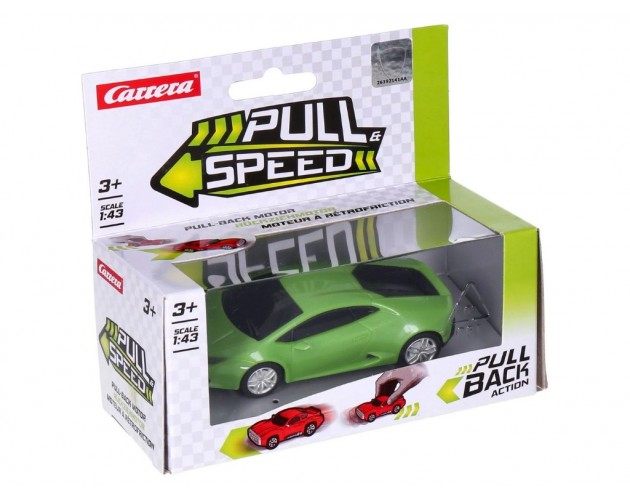 Carrera Avto Pull&Speed Lamborghini Huracan LP 610-4 zelen - Doživi hitrosti in dirkalno vzdušje s Carrera Pull&Speed Lamborghini Huracan LP 610-4 v živahni zeleni barvi! To Pull-Back-avtoček je zasnovan za male ljubitelje dirk in prinaša ure zabave in akcije neposredno v otroško sobo. Zahvaljujoč preprosti tehnologiji vleci-in-spusti se lahko že otroci od 3. leta naprej enostavno podajo na dirkalno avanturo, ne da bi potrebovali baterije ali dodatno opremo.Vsak poteg avtomobila nazaj napolni njegovo “motorno energijo”, ki se sprosti ob spustu – avto pospeši in se poda na svojo dirko. Tako lahko otroci organizirajo svoje lastne dirke, tekmujejo s prijatelji ali preprosto uživajo v hitri vožnji po tleh ali mizi. Pull&Speed sistem omogoča natančen nadzor nad avtomobilčkom in spodbuja koordinacijo oči in rok, fino motoriko ter ustvarjalno igro.