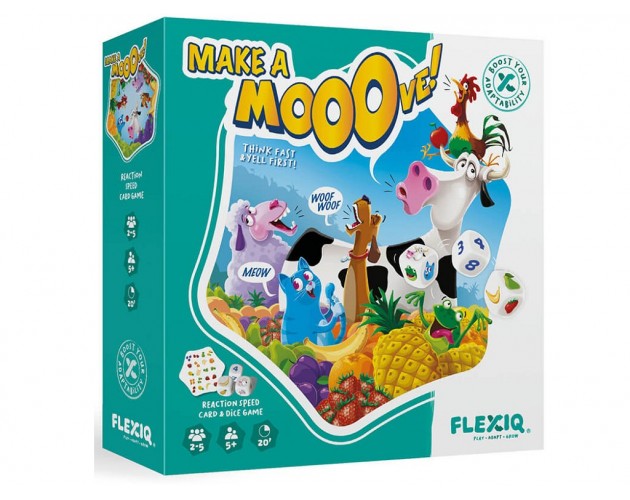 FLEXIQ Make a Mooove je kartna in kockna igra, kjer pomagate živalim razvrščati kup sadja. Bodite prvi, ki najde pravo sadje ali izvede živalski zvok, saj se vam lahko zgodi, da boste morali narediti tudi živalski zvok!Kako Igrati:
