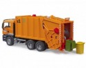 Bruder kamion MAN TGS smetar 03760 je odlično vsestransko vozilo za gradbišča, prevoz na dolge razdalje in lokalno distribucijo. Zaradi vzdržljive zasnove, zmogljivih motorjev in nadpovprečne nosilnosti je ta tovornjak prototip pogosto opisovanega "vsestranskega vozila" z veliko inovacijami na krovu. Dvobarvna kabina ima vrata, ki jih je mogoče odpreti. Celoten postopek nakladanja in razkladanja smetarskega vozila nadzoruje edinstven mehanizem z vrtljivim kolesom, s katerim je mogoče hkrati izprazniti dva smetnjaka. Zaradi prilagodljive nosilne konzole je enak postopek mogoč tudi za zabojnik za odpadke. Postopek: koša za smeti se potisneta v nosilno konzolo, nato pa se odpadki dvignejo in izpraznijo v odlagalno korito. Ko se kolo obrne, se ti potegnejo v funkcionalni stiskalni mehanizem, se stisnejo in nato prepeljejo v zabojnik za odpadke. Ta postopek je nazorno prikazan skozi okno za gledanje. Z ročajem na vrhu zabojnika za odpadke se odpadki odlagajo. Z obračanjem tega ročaja se odpadki s pomočjo izpustnega drsnika prenesejo nazaj, mimo dvignjene enote za nakladanje in razkladanje. Sliko dopolnjujeta dva majhna koša za smeti in tekalne pnevmatike. Vozilo za zbiranje odpadkov MAN TGS je lahko opremljeno s kompletom košev za smeti (3 majhni in 1 velik koš), št. izdelka: 02607. Lastnosti:- primerno za 4+ let