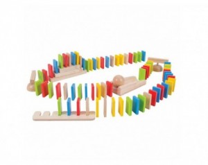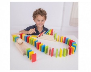 Obsežen leseni komplet domin, ki bo otroke in celo odrasle zabaval ure in ure; ko postavljajo domine v vrsto zaporedij, jih podrejo in ponavljajo znova in znova! Ta 110-delni komplet je opremljen s kroglo, klančino, dvema menjalnikoma smeri in stopnicami, ki jih lahko dodate poljubnemu zaporedju, da je še bolj vznemirljivo! Zabava se tu še ne konča, otroci lahko ustvarjajo s pomočjo knjig, ovitkov za CD in drugih varnih predmetov po hiši, da oblikujejo svoje zaporedje! Odličen način za preizkušanje potrpljenja, razvijanje prepoznavnosti barv in spodbujanje ustvarjalne in domiselne igre. Izdelano iz visokokakovostnih, odgovornih materialov. V skladu z veljavnimi evropskimi varnostnimi standardi. Starost 3+ leta. Sestavljeno iz 110 igralnih del.