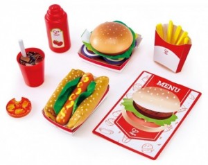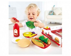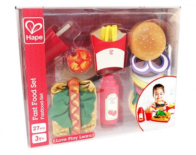 Hape Set za hitro prehrano - Pripravite se na poslastico. Danes bomo jedli v restavraciji s hitro prehrano! Set za hitro prehrano je čudovit komplet igrač, ki otrokom omogoča, da vstopijo v svet domišljijske igre in se preizkusijo v vlogi kuharja ali natakarja. S tem setom za večerjo v ameriškem slogu se igračke združujejo s poučnim in zabavnim doživetjem, saj otrokom omogoča, da simulirajo pripravo in postrežbo priljubljenih hitrih obrokov. Komplet vsebuje realistične replike hitre prehrane, ki jih lahko najdemo v ameriških restavracijah. Vključuje meni, ki dodaja še več domišljijskih možnosti igre, ter podrobne igrače burgerja, hotdoga, kečapa, krompirčka in gazirane pijače. Vsak element je izdelan z natančnostjo in skrbjo do detajlov, kar daje otrokom občutek, kot da bi pripravljali in postregli pravi obrok. Otroci lahko v tej domišljijski igri razvijajo različne veščine, kot so ročne spretnosti, socialne veščine in ustvarjalno razmišljanje. Igranje s tem setom spodbuja sodelovanje med otroki in razvija njihovo sposobnost reševanja problemov, saj si izmišljajo različne scenarije in vloge v restavraciji. Set za hitro prehrano Hape je izdelan iz visokokakovostnih in varnih materialov, kar zagotavlja dolgotrajno in varno igralno izkušnjo. Je tudi odlično darilo za otroke, saj združuje zabavo in izobraževanje v privlačnem paketu. S tem kompletom lahko otroci odkrivajo radosti ustvarjanja in razvijajo svojo domišljijo ter kreativnost skozi igro. Velikost pakiranja: 20 x 10 x 24 cm Proizvajalec: HapeOpozorila in varnostni ukrepi ob uporabi nekaterih kategorij igrač.
