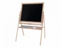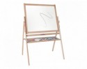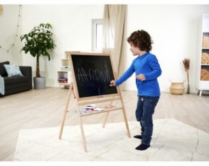 Tabla je izdelana iz kakovostnega bukovega lesa, stabilna in samostoječa, primerna za uporabo v otroški sobi ali igralnici. Dvojna površina omogoča risanje z barvnim markerjem na eni strani in kredo na drugi, pri čemer se risbe enostavno pobrišejo, tako da je tabla vedno pripravljena na nove ustvarjalne podvige. Priložena je tudi praktična polička za shranjevanje pisalnih potrebščin, kar pomaga ohranjati red in organizacijo.