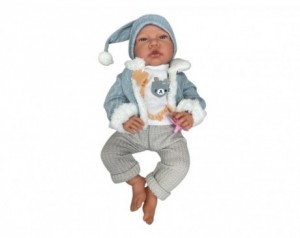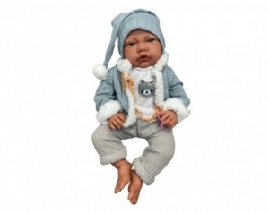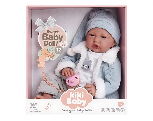 Igrača dojenček z zvokom - moder - Ta mehka igrača dojenček je popoln spremljevalec za otroke, ki radi igrajo igro vlog in razvijajo občutek za nego in skrb. Dojenček je visok 40 cm in je idealne velikosti za objemanje in nošenje. Oblačila in dodatki Igrača je oblečena v mehko bež pižamo z modro jopico, ki ji dodaja toplino in domačnost, obenem pa ima na glavi kapico s cofom, ki dojenčka naredi še bolj prikupnega. Priložena je tudi roza duda, ki dodatno spodbuja nego in domišljijsko igro. Zvoki in interaktivnost Posebnost tega dojenčka so interaktivni zvoki, ki jih izda ob pritisku na trebušček. Kar 12 različnih zvokov – od smeha, joka, vzdihov do nežnih zvokov – omogoča otrokom občutek, da skrbijo za pravega dojenčka. Zaradi teh zvokov igrača dobi čar realistične igre in zabave. Pripravljen za igro Dojenčku so priložene tudi baterije, tako da je pripravljen na igro takoj, ko ga otroci odvijejo iz embalaže. Zaradi mehkega telesa in prijetnih materialov je igrača prijetna na dotik, varna in primerna za otroke. Ključne lastnosti:- Velikost igrače: 40 cm