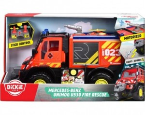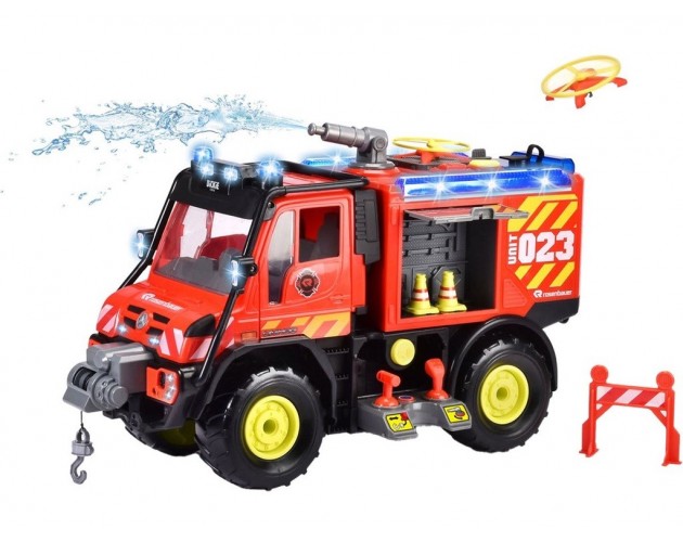 Mercedes-Benz Unimog U530 Gasilec - To gasilsko vozilo je idealna igrača za male gasilce, ki sanjajo o tem, da bi enkrat postali pravi junaki. Z licencami priznanih znamk Mercedes Benz, Unimog in Rosenbauer ponuja realistično igro z dodatnimi funkcijami, ki spodbujajo domišljijo in kreativnost otrok. Interaktivne funkcije, kot so luči, zvoki, premična vrata, izstreljevalci dronov, vodna cev in daljinski upravljalnik, zagotavljajo ure zabave in učenja. Priložene testne baterije omogočajo takojšnjo uporabo igrače.Lastnosti: