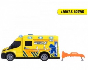 Dickie Iveco reševalno vozilo - Ko v otroški sobi zazvoni klic 112, se otroci prelevijo v male reševalce. Uradno licencirano reševalno vozilo Iveco Daily v merilu 1:32 je oblikovano po resničnem modelu in pritegne pozornost z značilno obliko ter številnimi detajli, ki jih otroci zlahka prepoznajo.Vozilo ima odpirajoča se zadnja vrata, kar omogoča takojšen dostop do "pacijenta". Priložena oranžna nosila imajo zložljivo ogrodje – tako jih lahko otroci enostavno raztegnejo na mestu “nesreče” ali zložijo za prevoz v reševalnem vozilu.