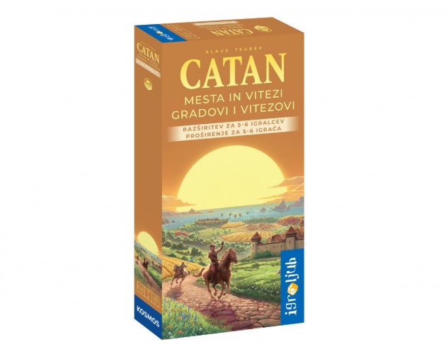 Catan Mesta in vitezi - dodatek za 5/6 igralca - Ta dodatek ni samostojna igra – za igranje potrebujete osnovno igro Catan, razširitev Mesta in vitezi ter dodatek Catan 5/6 igralcev.Dodatek omogoča, da se ena izmed najbolj priljubljenih in zahtevnejših razširitev, Mesta in vitezi, igra tudi v večji družbi. Zdaj lahko v bitki proti barbarom in pri gradnji mogočnih metropol sodeluje 5 ali 6 igralcev. To prinese še več tekmovanja, strateških odločitev in napetih trenutkov, saj bo treba usklajevati trgovanje, obrambo pred sovražniki ter razvoj mest.