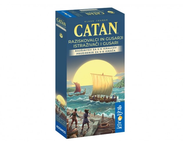 Catan Raziskovalci in gusarji - dodatek za 5/6 igralca - Ta dodatek ni samostojna igra – za igranje potrebujete osnovno igro Catan, razširitev Raziskovalci in gusarji ter dodatek Catan 5/6 igralcev. Skupaj torej štiri škatle.Dodatek omogoča, da se razburljiva pustolovščina raziskovanja novih otokov, spopadov z gusarji, trgovine z ribami in začimbami razširi na večjo družbo – zdaj lahko sodeluje 5 ali 6 igralcev. S tem se igra podaljša, poveča se konkurenca pri trgovanju in raziskovanju ter dodatno stopnjuje napetost pri izpolnjevanju misij.