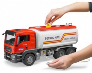 Bruder tovornjak Man TGS cisterna 03775 - MAN TGS je odlično vsestransko vozilo za gradbišča, prevoz na dolge razdalje in lokalno distribucijo. Zaradi vzdržljive zasnove, zmogljivih motorjev in nadpovprečne nosilnosti je ta tovornjak vsestransko uporabno vozilo z veliko inovacijami na krovu. Bruderjev model tovornjaka cisterne MAN TGS v merilu 1:16 je kombinacija nove kabine MAN in prenovljene nadgradnje cisterne. Ta popolnoma funkcionalna nadgradnja cisterne prinaša tudi številne nove funkcije za naše mlade voznike cistern. Napolnite cisterno z vodo. Z ročno upravljano črpalko s stisnjenim zrakom ustvarite pritisk in z uporabo zaporne ročice z izpustno enoto spustite vodo skozi cev. Bworld figure lahko postavite v kabino ali pa se po lestvi povzpnete na vozilo in pregledate cisterno z vrha. Ta model je združljiv tudi s svetlobnim in zvočnim modulom (št. izdelka 02801). Lastnosti:- primerno za 4+ let