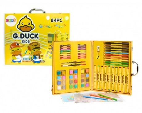 84-delni umetniÅ¡ki komplet je idealen za male ustvarjalce, ki želijo raziskovati svet umetnosti. Komplet vsebuje vse potrebno za risanje, slikanje in barvanje, zapakirano v živahen rumen kovÄek z motivom raÄke.