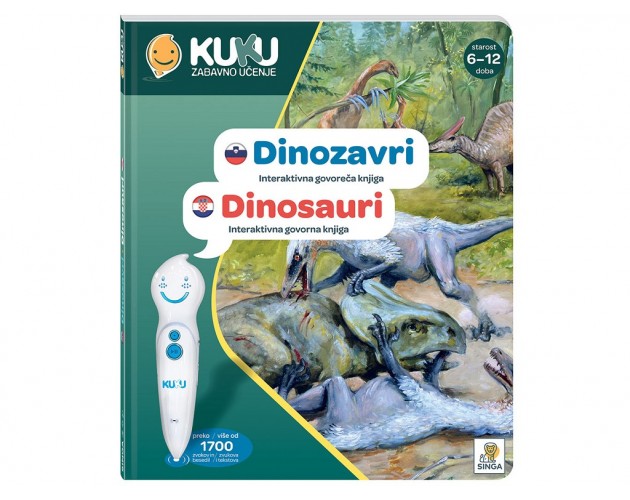 Interaktivna knjiga KUKU - Dinozavri (brez pisala) Spoznaj prazgodovinska obdobja in življenje teh nenavadnih bitij od njihovega rojstva do izumrtja, ki ga je povzročil trk velikanskega meteorita. Knjiga, polna čudovitih ilustracij, temelji na najnovejših znanstvenih spoznanjih in bo navdušila tako mlade raziskovalce kot starejše pustolovce. Knjiga vsebuje prek 1700 zvokov in besedil. POSLUŠAJ KNJIGO! Kuku – Zabavno učenje je edinstven sistem učenja, ki prinaša obilo informacij in zabave. S pisalom se na rahlo dotaknite slike ali besedila in zaslišali boste ustrezne informacije, zvok ali glasbo. Interaktivno pisalo ponuja vedno nova doživetja. POZOR: KNJIGA DELUJE LE Z INTERAKTIVNIM PISALOM KUKU – ZABAVNO UČENJE! INTERAKTIVNO PISALO NI PRILOŽENO. Za pravilno delovanje interaktivnega pisala je potreben prenos ustreznih zvočnih datotek. Za prenos zvočnih datotek je potreben računalnik. KUKU – Zabavno učenje je edinstven didaktični koncept, pri katerem otroci na zabaven in privlačen način pridobijo obilo zanimivih in poučnih informacij. Branje s pomočjo interaktivnega pisala KUKU je posebno učno doživetje, saj se besedam in slikam z enim dotikom pridružijo tudi zvoki. Več na www.zabavnoucenje.com Uvoznik v EU : Singa d.o.o.Opozorila in varnostni ukrepi ob uporabi nekaterih kategorij igrač.