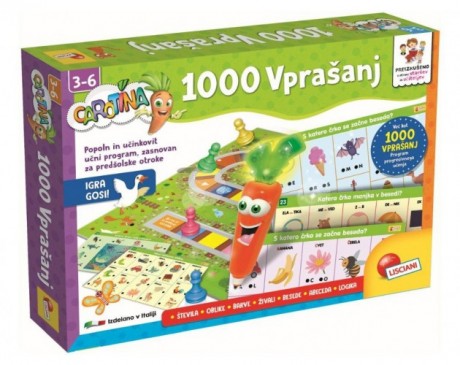 Lisciani izobraževalna igra 1000 vprašanj je interaktivna izobraževalna igra, namenjena otrokom od 3. leta naprej. Igra spodbuja učenje skozi zabavo in vključuje številne interaktivne kartice, ki otrokom pomagajo razvijati osnovna znanja in veščine. Ob pravilnem odgovoru pisalo zasveti in otrok prejme veseli nagradni zvok, ob napačnem odgovoru pa ga igra spodbuja k ponovnemu poskusu.Otrok se skozi igro nauči: