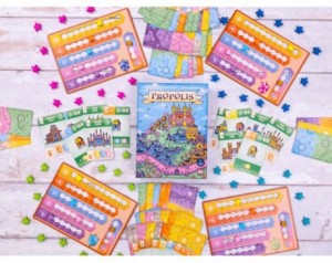 Družabna igra Propolis je strateška igra za 1–4 igralce, ki združuje postavljanje delavcev, gradnjo območij in zbiranje točk. Igralci prevzamejo vlogo čebeljih kolonij. Po vrsti pošiljajo delavske čebele, da zbirajo cvetni prah, utrjujejo svoje položaje in gradijo panje ter ugajajo kraljici.Igra vključuje zbiranje propolisa za gradnjo panjev, širjenje nadzora nad cvetličnimi območji in gradnjo novih struktur, ki omogočajo dodatne vire, točke in pogoje za gradnjo veličastne palače za kraljico. Cilj je dominirati nad območji in zgraditi najbolj prestižno domovanje.
