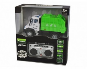 RC smetarski tovornjak 1:64 je majhen, a izjemno igriv daljinsko voden model, ki otrokom na zabaven način približa vsakodnevno delo smetarske službe. S svojo zeleno posodo za odpadke in belo voznikovo kabino je takoj prepoznaven, številni detajli, kot so simboli za recikliranje, pa še dodatno popestrijo igro. Primeren je za otroke že od 3. leta dalje in omogoča varno uporabo tako v notranjih prostorih kot na prostem.Posebnost tega modela je funkcionalen smetarski zabojnik, ki omogoča več načinov igre. Otrok lahko vanj shranjuje drobne predmete bodisi skozi zgornjo odprtino bodisi preko večje nakladalne odprtine na zadnji strani, s čimer igra postane bolj realistična in poučna. Rumena LED-osvetlitev na sprednjem delu poskrbi za boljši videz in večje navdušenje med vožnjo. Tovornjak je stabilen, okreten in prilagojen majhnim rokam, kar spodbuja razvoj koordinacije in osnovnih motoričnih spretnosti.