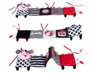 Knjigica je izdelana iz prijetnega, mehkega materiala, ki je varen za dojenčke. Kontrastne barve, kot so črna, rdeča in bela, spodbujajo razvoj vida, medtem ko raztegljiva oblika (harmonika) omogoča enostavno odpiranje in igranje.