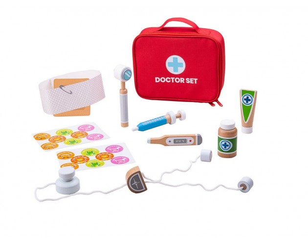 Doktorski komplet Bigjigs"Doktor, doktor!" Ta lesena doktorska garnitura v starinskem slogu vsebuje vse, kar potrebuje mladi zdravnik, da neguje bolne plišaste ali druge lutke. Otroci lahko s pomočjo stetoskopa poslušajo svoje pacientovo srce, s termometrom preverijo njegovo temperaturo in si z otoskopom celo pogledajo v ušesa. Ko je njihov bolnik pogumno sedel med pregledom, ga lahko zdravnik nagradi z nalepko "Bil sem pogumen". Ta obsežen komplet za pretvarjanje vključuje brizgo, medicinski gel, zdravilo, stekleničko, termometer, stetoskop, otoskop, povoj za glavo in nalepke "Bil sem pogumen", ki so na voljo v trdni škatli za zdravila z ročajem. Odličen način za spodbujanje ustvarjalnih in domiselnih iger vlog ter za pomoč otrokom, da razumejo postopek obiska zdravnika. Spodbuja socialne in jezikovne spretnosti, ko se otroci pogovarjajo s svojim pacientom in razpravljajo o svojem zdravju. Spodbuja negovanje vedenja in empatijo. Vsi kosi so močni in popolnoma majhni za majhne roke. Izdelano iz visokokakovostnih, odgovornih materialov. V skladu z veljavnimi evropskimi varnostnimi standardi. Starost 3+ leta.