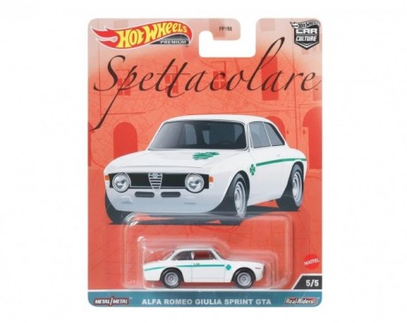 Hot Wheels Alfa Romeo Giulia Sprint GTA iz prestižne serije Spettacolare v merilu 1:64 je poklon eni najbolj slavnih italijanskih športnih ikon šestdesetih let. Originalna Giulia Sprint GTA je bila razvita kot lahka, dirkalna različica Giulie Sprint GT, z aluminijastimi karoserijskimi paneli in zmogljivim motorjem, ki ji je prinesel številne zmage v turnih dirkah in močan sloves v avtomobilskem svetu.Hot Wheels je to legendo avtomobilizma prenesel v miniaturno obliko z natančnostjo in občutkom za detajle. Model je izdelan v Metal/Metal izvedbi, kar pomeni kovinsko karoserijo in podvozje, ki zagotavljata robustnost in zbirateljsko vrednost. Real Riders gumijaste pnevmatike poskrbijo za realističen videz, medtem ko oblikovne linije, sprednja maska, značilna silhueta in klasični detajli popolnoma ujamejo značaj Giulie Sprint GTA.