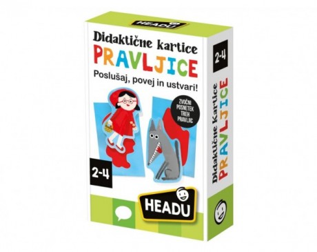 Komplet vključuje 12 trpežnih kartic z barvno ločenimi ilustracijami treh klasičnih pravljic: Sneguljčica, Rdeča kapica in Janko in Metka. Na vsaki kartici se nahaja prizor iz zgodbe, otrok pa lahko vstavi pripadajoče like in tako sestavi pravljično zaporedje. Na zadnji strani glavnih junakov je dodana QR-koda za poslušanje zvočne pravljice, kar omogoča tudi samostojno igro.
