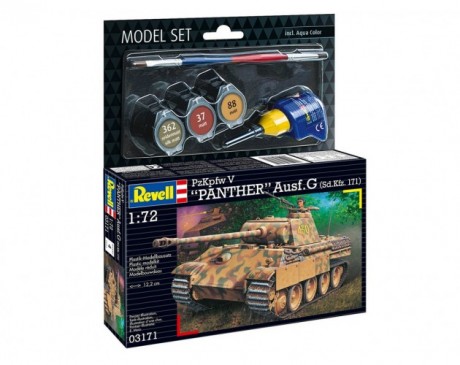 Revell Model Set Panther Ausf. G 63171 - Z modelom Panther Ausf. G v merilu 1:35 lahko poustvarite najizpopolnjenejšo različico enega najstrašnejših nemških tankov druge svetovne vojne. Z natančnimi detajli, zgodovinsko točnostjo in dodatki za zgodnjo ter pozno verzijo, je ta komplet popoln za vse strastne modelarje in ljubitelje vojaške zgodovine.