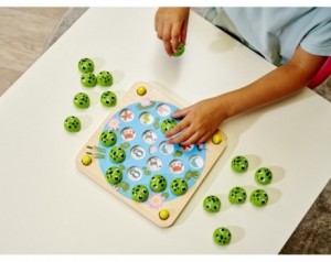 Noris igra spomina Žabice je čudovita igrača, ki otrokom omogoča zabavno in poučno izkušnjo. Njena privlačna zasnova z motivom žabic je še posebej primerna za majhne otroke, ki se šele začenjajo učiti in raziskovati svet okoli sebe. Namenjena je tako domači uporabi kot tudi v vrtcih in skupinah Montessori, kjer spodbuja razvoj različnih spretnosti. Glavni cilj igre je preprost: najti pare žabic. Otroci morajo skrbno opazovati in si zapomniti položaje žabic ter nato ugotoviti, kateri dve žabici sta enaki. Ta naloga spodbuja otrokov spomin, koncentracijo in opazovanje. Vsaka neuspešna izbira pomeni, da se žabice ponovno potopijo v vodo, kar dodatno motivira otroke, da si zapomnijo postavitev. Poleg zabave igra tudi izobražuje. Otroci se med igro učijo prepoznavati različne motive, kot so živali, vozila, dinozavri, številke in črke. To spodbuja kognitivni razvoj in širi otrokovo znanje o svetu okoli njih. Igra vključuje visokokakovostne lesene dele, kar zagotavlja trpežnost in varnost igrače. Leseni materiali so trajni in ekološko prijazni, kar je pomembno za otrokovo varnost in okolje. Zaradi svoje preproste narave je igra primerna za otroke že od tretjega leta starosti. Lahko se igra samostojno ali v skupini, kar spodbuja socialne interakcije, sodelovanje in razvoj komunikacijskih spretnosti med otroki. Trajanje igre približno 10 minut je idealno za otroke, saj ohranja njihovo pozornost in zanimanje ter hkrati omogoča večkratno igranje v eni seansi ali med krajšimi odmori. Noris igra spomina Žabice je tako odlična kombinacija zabave, učenja in kakovostne izdelave, ki bo zagotovo navdušila tako otroke kot tudi njihove starše in vzgojitelje. Proizvajalec: SimbaOpozorila in varnostni ukrepi ob uporabi nekaterih kategorij igrač.