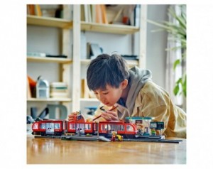 Komplet vsebuje 6 minifigur in psa vodnika, ki obogatijo igro, ter dodatke, kot so invalidski voziček, kavna skodelica, časnik, telefon in vozovnica. Postajna ploščad ima premostitvene plošče, ki se razširijo, ko tramvaj pripelje, kar otrokom omogoča realistično simulacijo vkrcavanja in izkrcavanja. S kombinacijo tramvaja in postaje lahko otroci ustvarijo svojo LEGO City zgodbo, raziskujejo mestno življenje in razvijajo domišljijo ter socialne veščine.
