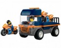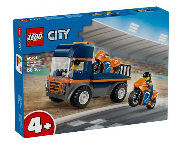 LEGO City Transportno vozilo za motorje je idealen začetni komplet za otroke, stare 4 leta in več, ki radi raziskujejo svet vozil, dirkanja in domišljijske igre. Komplet je zasnovan posebej za mlajše sestavljalce, saj omogoča hitro in enostavno sestavljanje ter takojšnjo igro. V središču dogajanja je tovornjak s ploščadno prikolico in debelimi gumijastimi pnevmatikami, ki delujejo realistično in so prilagojene otroškim rokam.Otroci lahko s pomočjo rampe naložijo in razložijo dva športna motorja ter se po prihodu na prizorišče podajo v razburljivo motoristično dirko. Priloženi sta dve minifiguri dirkačev s čeladama, ki spodbujata igro vlog, pripovedovanje zgodb in razvoj socialnih spretnosti. Dodatki, kot so viličasti ključ, skodelica in pametni telefon, omogočajo še več ustvarjalnih scenarijev, od priprav na dirko do počitka po njej.