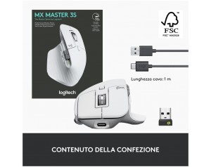 Logitech MX Master 3S. Faktor oblike: desno. Tehnologija zaznavanja gibanja: Optični, Vmesnik naprave: RF Wireless + Bluetooth, Ločljivost gibanja: 8000 DPI, Tip gumba: Pritisnjeni gumbi, Število gumbov: 7, Vrsta drsenja: Kolesce. Vir napajanja: baterije. Barva izdelka: srebrna, bela.
